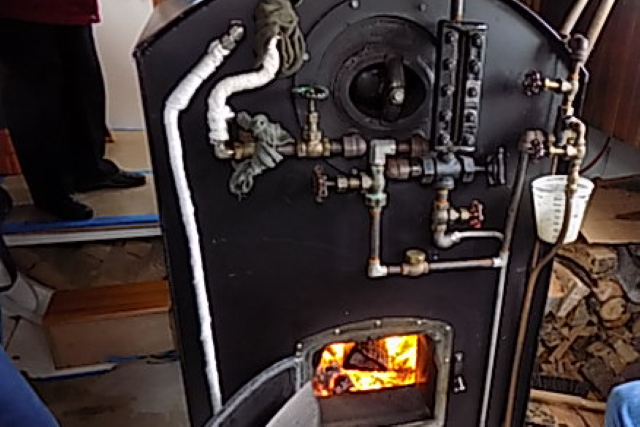 Paul and his father Dave Hylton designed and engineered a new watertube boiler similar to the original in 2012. Their machinist friend and fellow steam enthusiast Andrew Van Luenen of Arlington, WA fabricated the boiler in his shop in 2013. Chief engineers to design, install and plumb the steam machinery were Paul and his dad Dave.