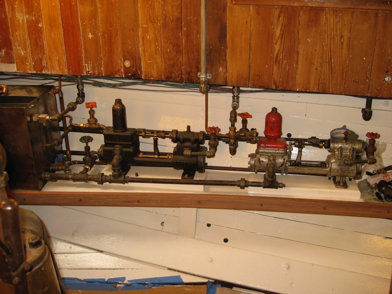A new pump shelf was fabricated on the port side of the engine room. The original steam Knowles steam feed pump is on the left. The five-gallon hotwell, which serves as an intermediate tank between the condenser and the boiler, is to the far left.