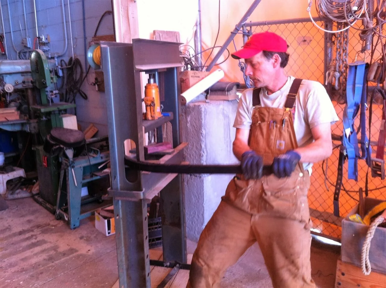 Forty steambent sister frames were added by way of the boiler, engine and bridge deck. Here is one hot out of the box, Andy pre-bending it before installation.