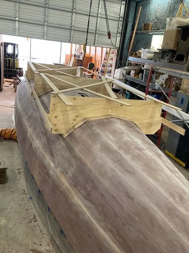The frames and planks are constructed from sheets of plywood cut with Computer Aided Design and the hull is stitch and glue epoxy method. Carbon fiber, lamination and vacuum pump technology strengthens the frame that rings the mast step and keel strut. This is part one of a series.